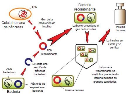 Esta tecnología utiliza bacterias, virus o leva- duras y en su interior se producen de forma rutinaria proteínas de importancia médica. La primera proteína elaborada de ADN recombinante fue la insulina, en 1982. La insulina ya se utilizaba en tratamientos para enfermos con diabetes mellitus, pero se obtenía de páncreas del cerdo o de res y, a pesar de las muchas semejanzas a la insulina humana, existían pequeñas diferencias, además de que estos animales no tenían ningún cuidado especial, por lo cual su administración ocasionaba alergias a 5% de los pacientes.