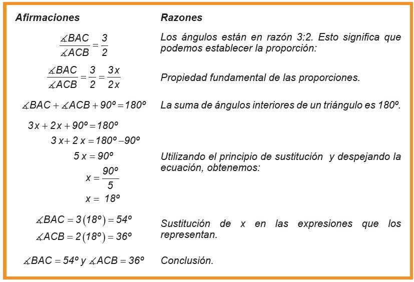 Si los ángulos agudos de un triángulo rectángulo están a razón 3:2 (figura 3.2) ¿Cuáles son sus medidas?