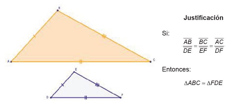 Si los tres lados de un triángulo son proporcionales, éstos son semejantes. Se muestra en la figura 3.13.