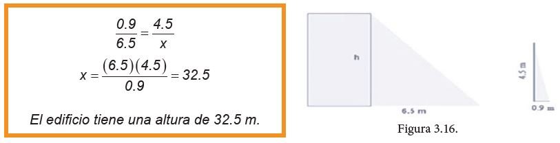 Ejemplo 1: Calcula la altura de un edificio que proyecta una sombra de 6.5 m a la misma hora que un poste de 4.5 m de altura da una sombra de 0.9 m. Esto muestra la figura 3.16.