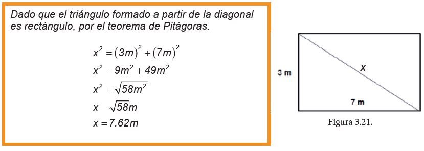 Ejemplo 1: En la figura 3.21 halla la longitud de la diagonal de un rectángulo cuyas dimensiones son 3 y 7 m, respectivamente.