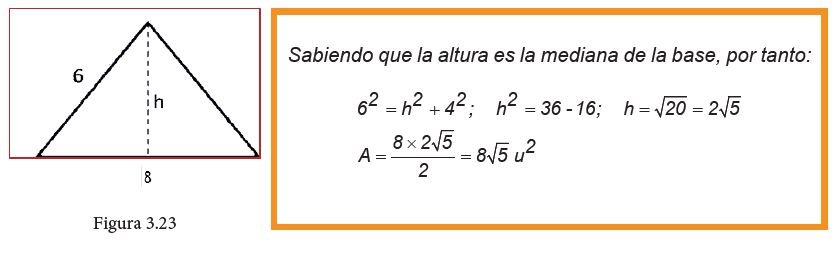Ejemplo 4: En la figura 3.23 se tiene un triángulo isósceles cuyos lados iguales miden 6 y su base mide 8 ¿Cuál es el valor del área del triángulo?