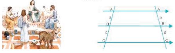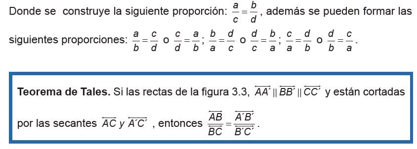 En la antigüedad, el filósofo griego Tales de Mileto (624-547 aC) diseñó, a partir de observaciones simples, un método para medir elementos que le resultaban curiosos. Por ejemplo: las pirámides de Egipto, los árboles que lo rodeaban, e incluso las alturas de algunos de sus conciudadanos que obtenía utilizando segmentos proporcionales. Al realizar los cortes en sus zanahorias (o probablemente algún elemento que tuviera a su disposición), descubrió las bases de lo que conocemos actualmente como teorema de Tales. Dicho teorema establece lo siguiente: “Si tres o más paralelas cortan a dos transversales o secantes, determinan en ellas segmentos correspondientes proporcionales”. Este teorema lo verás representado en la figura 3.3.