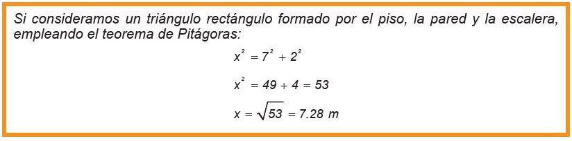 Ejemplo 3: Eduardo necesita subirse a la azotea de su casa, la cual tiene 7 m de alto. Para ello debe valerse de una escalera cuya base o pie de escalera debe estar a 2 m de distancia de la pared por motivos de seguridad. ¿Qué longitud debe tener la escalera para que Eduardo pueda alcanzar la azotea?