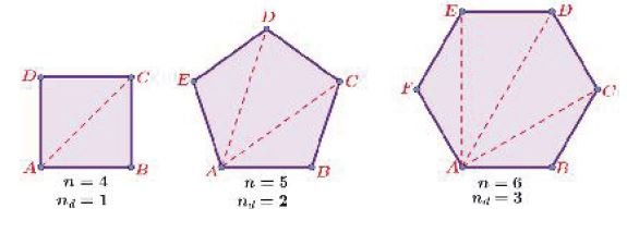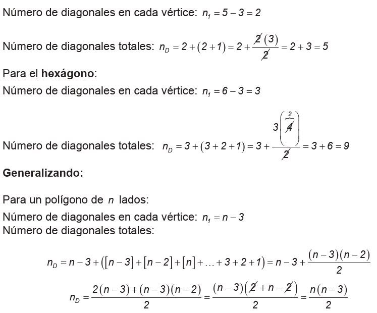 Podemos darnos cuenta que la diferencia entre el número de lados del polígono y la cantidad de diagonales que se pueden trazar desde uno de sus vértices es 3, por lo que se puede afirmar que el número de diagonales ( nD ) que se pueden trazar en el polígono de n lados desde cualquiera de sus vértices está dado por la expresión: nD= n − 3.