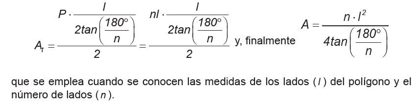 El área de cualquier polígono regular de n lados se obtiene con la mitad del producto de su perímetro por su apotema. La fórmula para el área es: