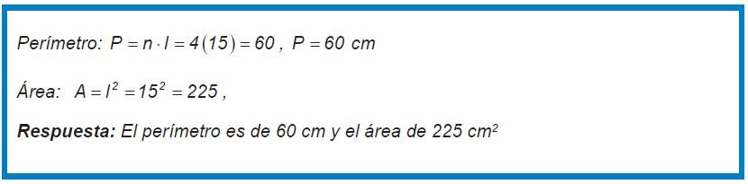 Ejemplos 1: Calcular el área y perímetro de un cuadrado de 15 cm de longitud por lado.