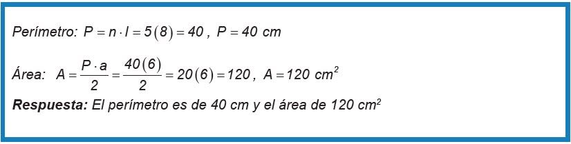 Ejemplo 2: Calcular el área y perímetro de un pentágono que tiene lados de 8 cm de longitud y apotema de 6 cm.