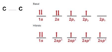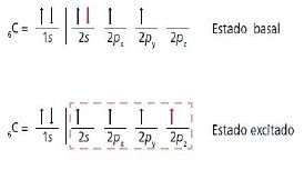 De acuerdo con el ejercicio anterior, si el carbono sustentara esta configuración se podrían formar sólo compuestos divalentes, ya que los únicos electrones que participarían en el enlace serían los 2p1x y 2p1y, sin embargo, esto no permitiría la formación de compuestos orgánicos donde el carbono es tetravalente como el caso del metano.