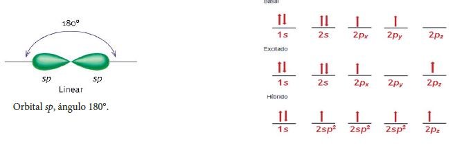 Los dos orbitales híbridos (sp) se ubican en un solo plano, produciendo un átomo de carbono en disposición colineal plana, con un ángulo de separación de 180°. Los dos orbitales puros se distribuyen en forma perpendicular al plano en donde se hallan los dos orbitales sp.