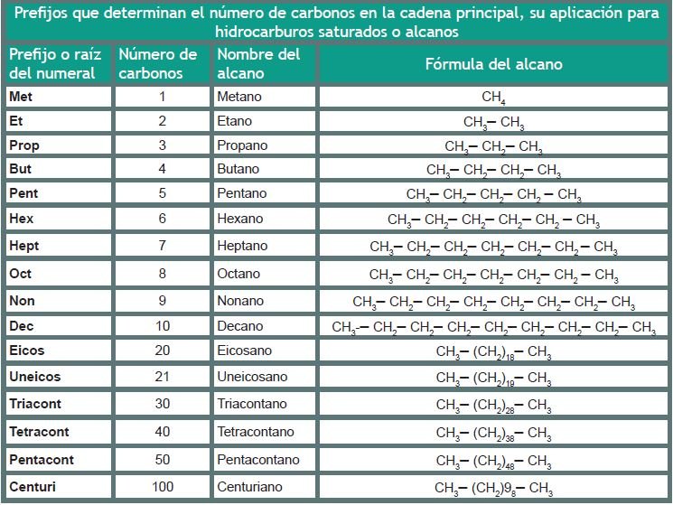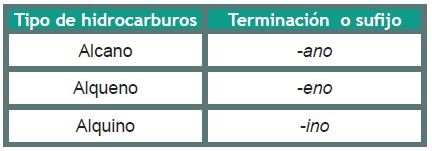 Así, los hidrocarburos se forman con la raíz del numeral griego o latino (que indica el número de carbonos presentes en la cadena) y la terminación: -ano, -eno o -ino, corresponda.