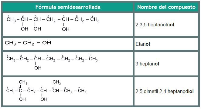 Son compuestos orgánicos que contienen un grupo -OH. Se forman cuando en los hidrocarburos se sustituye uno o más átomos de hidrógeno por uno o más grupos hidroxilo (-OH). La nomenclatura de estos compuestos sigue las normas descritas para los hidrocarburos, sólo que la cadena principal debe contener al grupo funcional y enumerarse de tal manera que éste reciba el índice más bajo posible. No olvidar que debemos agregar la terminación -ol.