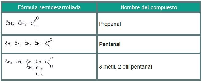 Los aldehídos son compuestos utilizados en la industria para la fabricación de polímeros (plástico) y en los laboratorios para la conservación de animales muertos. La nomenclatura de estos compuestos sigue las normas descritas para los hidrocarburos, sólo que la cadena principal debe contener al grupo funcional. En el caso de los aldehídos el carbono del grupo funcional siempre recibe el número 1, por encontrarse en el extremo de la cadena. No olvidar que debemos agregar la terminación -al.