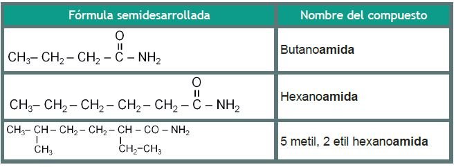Para nombrar las amidas simples se designan como derivados de los ácidos carboxílicos, eliminando la palabra ácido y cambiando la terminación –ico por – amida. A las amidas monosustituidas y disustituidas se les coloca la letra N antes del nombre del radical alquilo, y después de éste el nombre de la amida correspondiente.