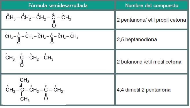Generalmente las cetonas son líquidas hasta 15 carbonos, de 16 en adelante son sólidas. Ejemplo de estos compuestos son los utilizados como solventes de secado rápido como la acetona. La nomenclatura de estos compuestos sigue las normas descritas para los hidrocarburos, sólo que la cadena principal debe contener al grupo funcional ceto, y al momento de nombrarla se debe indicar su posición.