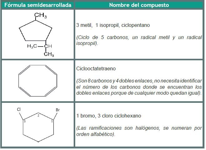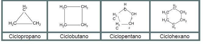 Recordemos que en los compuestos orgánicos también se pueden dar las cadenas cerradas o cíclicas y algunas de ellas tienen relación con las figuras geométricas que viste en tu bloque 4 del curso de Matemáticas II. Para nombrarlas anteponemos el prefijo ciclo seguido del alcano correspondiente al número de carbonos, por ejemplo: