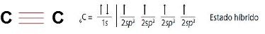 La combinación de un orbital s con un orbital p, da lugar a dos orbitales híbridos sp y dos orbitales puros. Esto se presenta como carbonos unidos por enlaces triples.