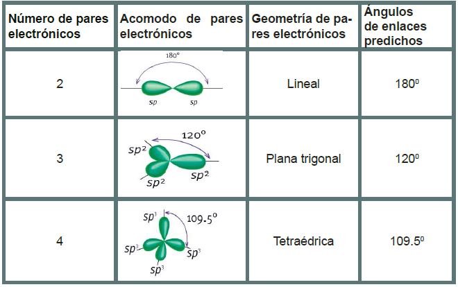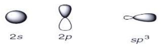 Los cuatro orbitales híbridos (sp3) formados se disponen en el espacio, buscando estar lo más alejados posibles unos de otros. En consecuencia, cada orbital sp3 se dirige a cada uno de los cuatro vértices de un tetraedro con un ángulo de 109.5o.