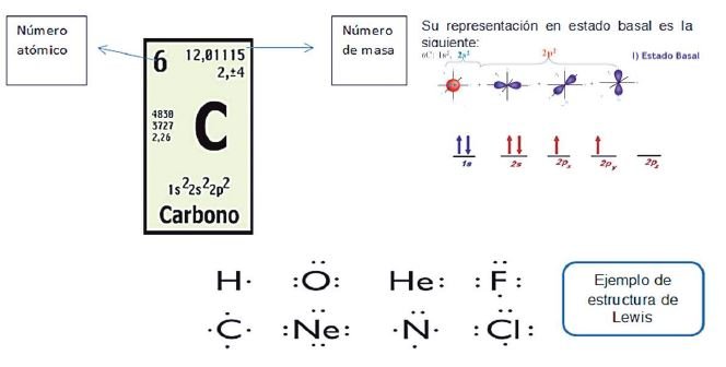 La forma como se presentan los orbitales anteriores se le conoce como estado de reposo, siendo la forma de mayor estabilidad. Para recordarlo escribe la configuración electrónica de los siguientes átomos, identifica los electrones de valencia y asocia esta información con la familia de la tabla periódica a la que pertenece cada elemento, también escribe la representación de Lewis para cada uno.