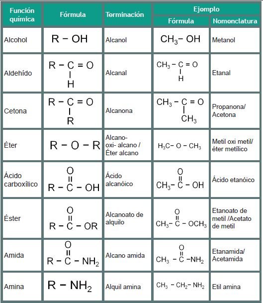 A continuación se presenta una tabla con las principales funciones químicas con su grupo funcional y nomenclatura.