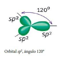 Un electrón de py se traslada a pz y después un electrón de s, pasa a py. Los tres orbitales híbridos (sp2) se ubican en un mismo plano, produciendo un átomo de carbono en disposición trigonal plana, con un ángulo de separación de aproximadamente 120o.